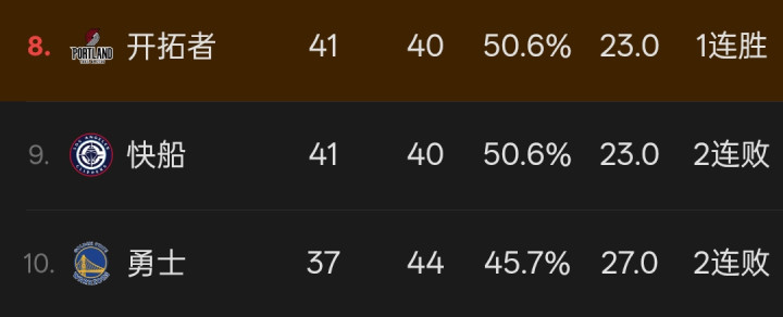 快船和开拓者现在都是 41 胜 40 负,但开拓者交手战绩占优。